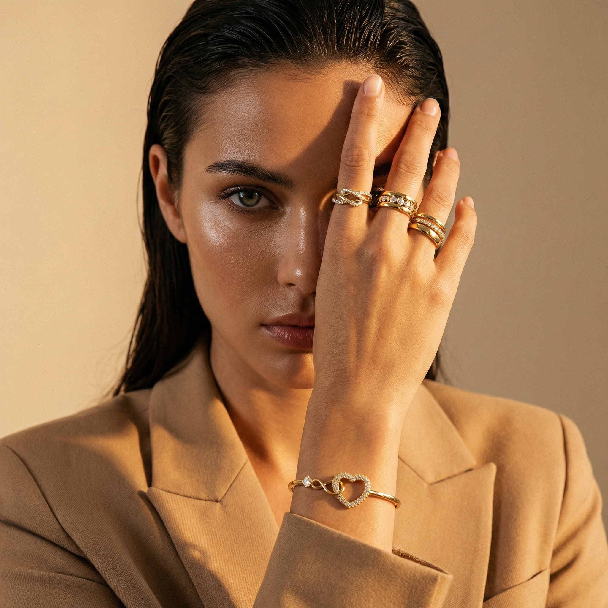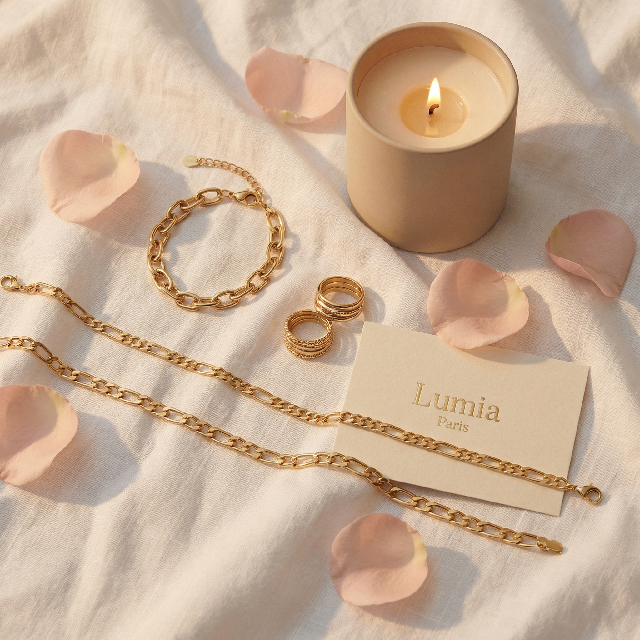 At Lumia Paris, we use only the highest-quality materials, including hypoallergenic, waterproof, and tarnish-resistant options like PVD gold plating over stainless steel and premium alloys. These materials are carefully selected to ensure durability and allow for everyday wear, while maintaining the timeless elegance of each piece.